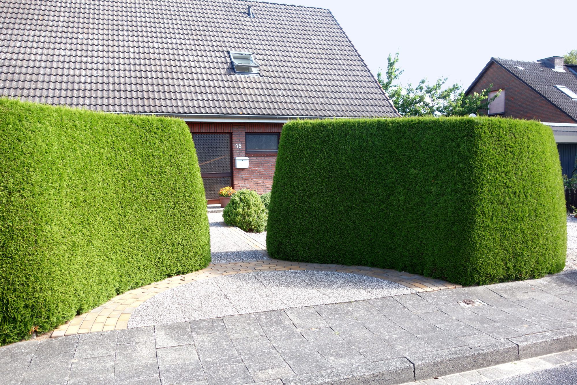 Eine Hecke wie eine Skulptur: sieht gut aus und man sieht nicht durch. Mit der richtigen Auswahl der Gehölze und einer regelmäßigen Pflege entsteht eine lebende grüne Wand, in der sich auch Vögel und andere nützliche Gartentiere wohl fühlen.